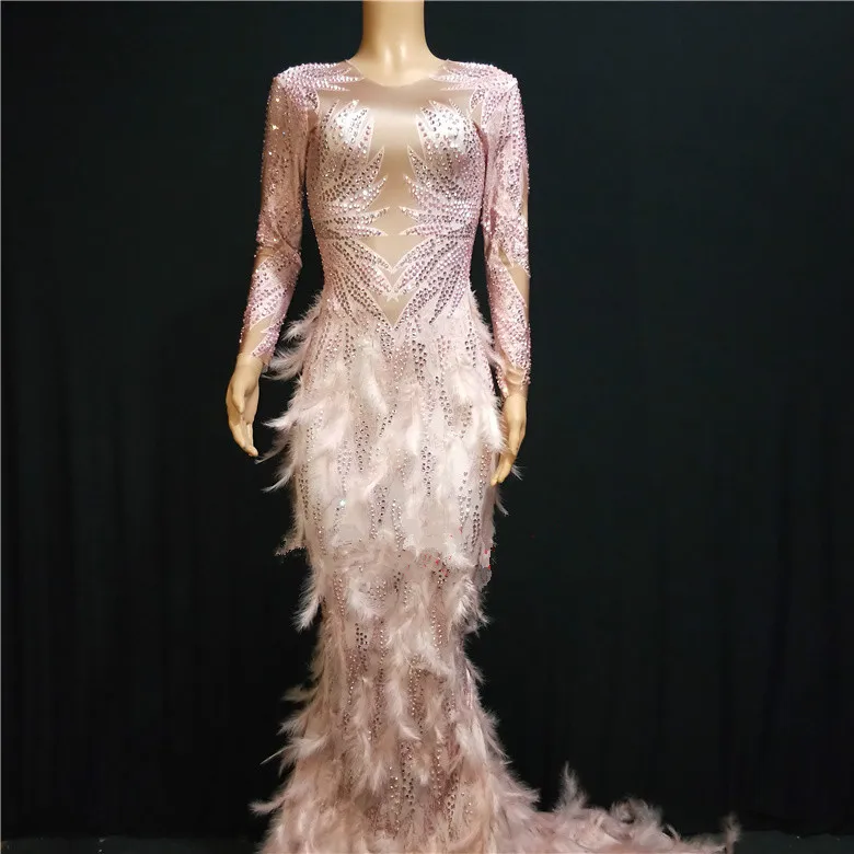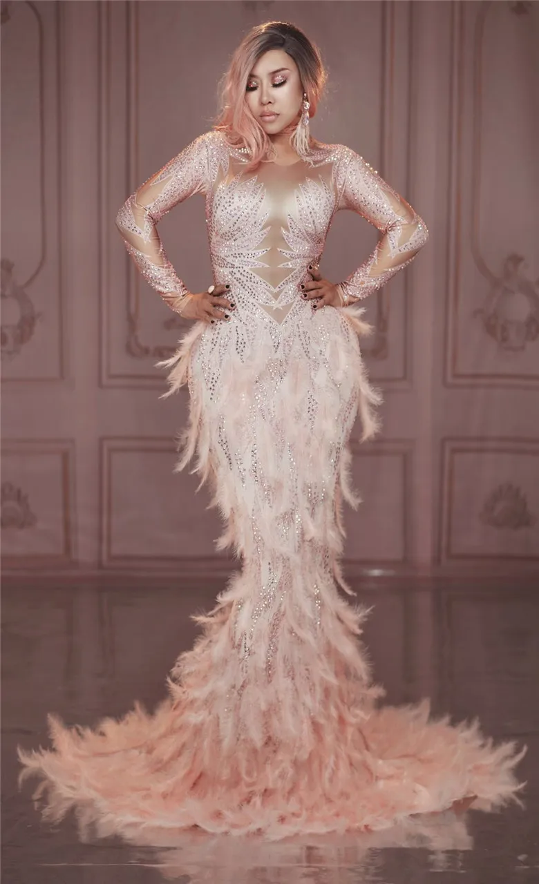 Hot Sparkling Rhinestones Pink Feathers Nude Performances Sexy Full Stone Long Tail Costume Dance P