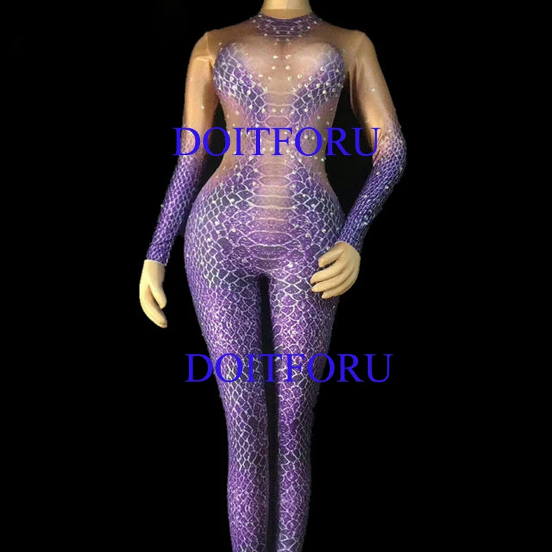 nightclub Purple Snake Bodysuit singer DJ stage show Stones Stretch Costume Dance jumpsuit party fa