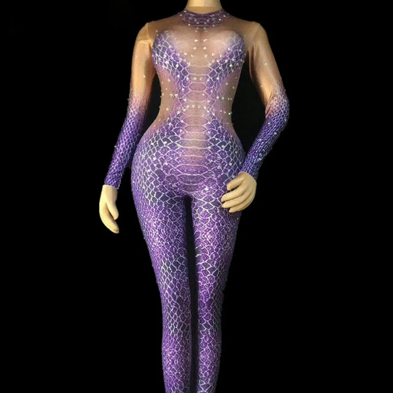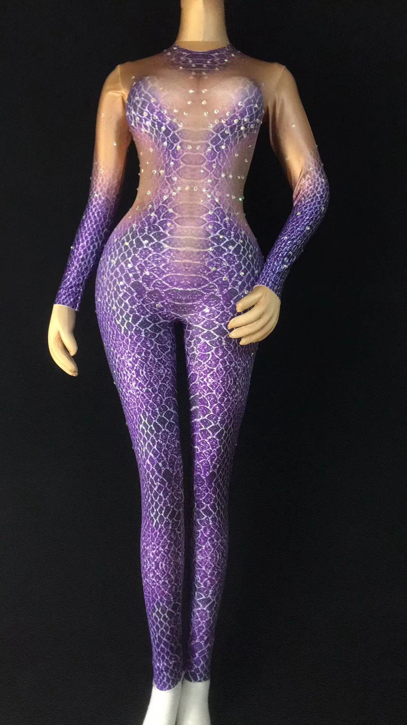 Review nightclub Purple Snake Bodysuit singer DJ stage show Stones Stretch Costume Dance jumpsuit party fa